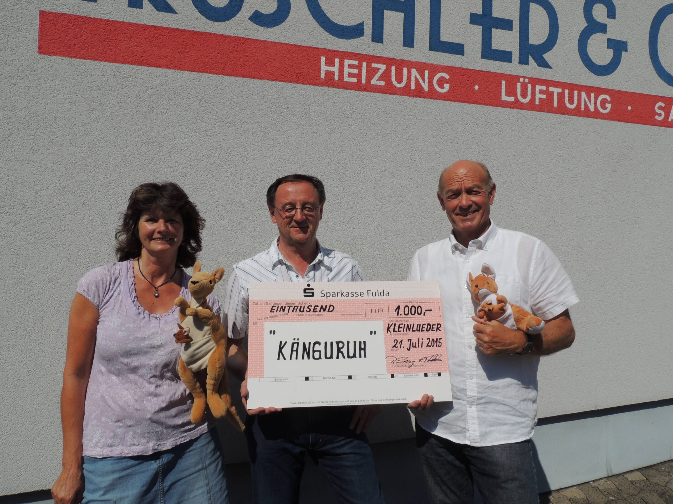 Die Firma Trüschler & Geiling aus Großenlüder, ein alteingesessenes Unternehmen für Heizung, Lüftung und Sanitär, hatte in diesem Jahr ihr 25-jähriges Firmenjubiläum. Anstatt einer großen Feierlichkeit entschlossen sich die Geschäftsführer Stefan Trüschler(ganz rechts) und Rainer Geiling(mitte), lieber 1000 Euro an den Förderverein „Känguruh“ zu spenden. Susanne Möller, Vorsitzende von „Känguruh“, nahm die Spende dankend entgegen, die für allgemeine Verbesserungen in der Kinderklinik im Klinikum Fulda gedacht ist.